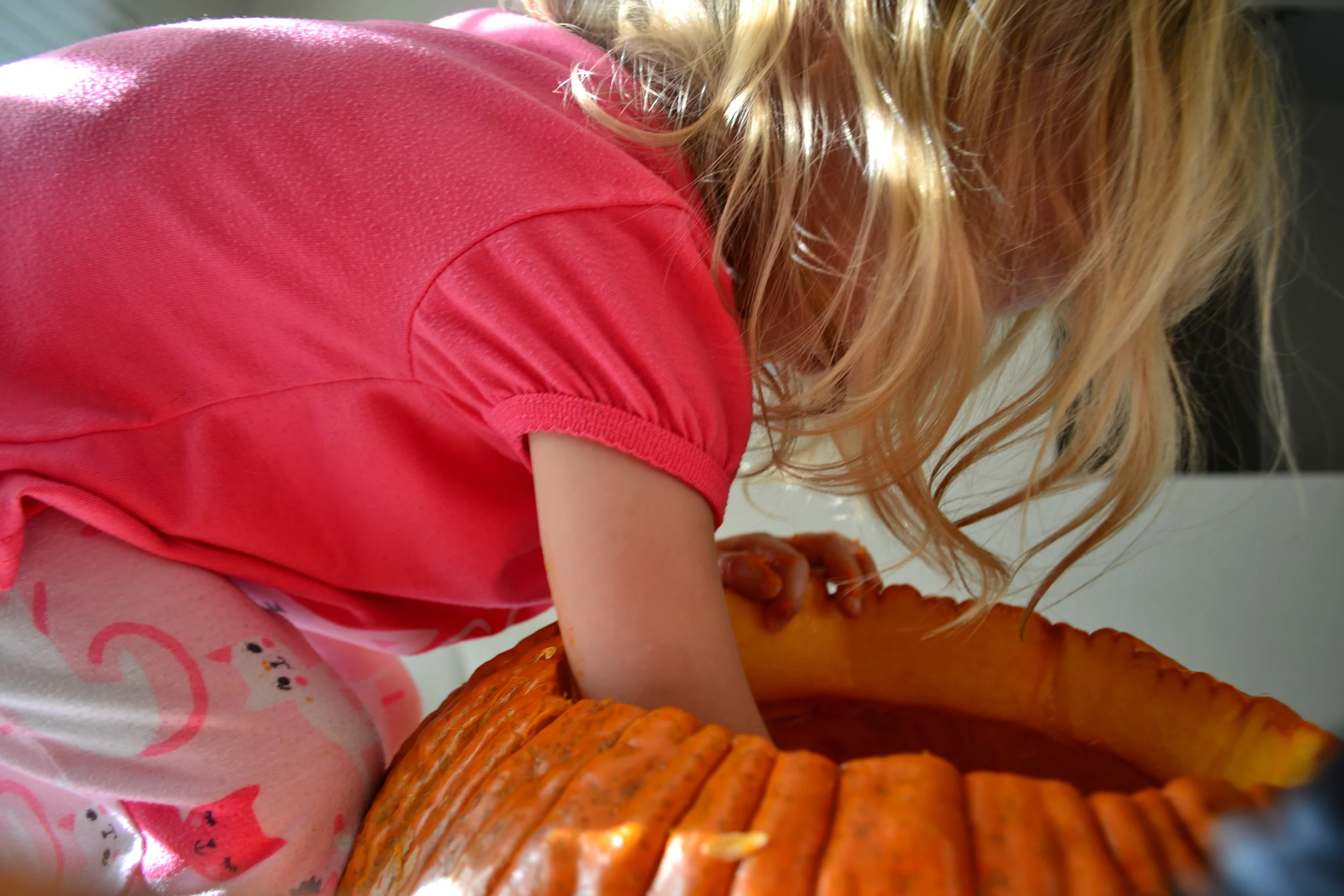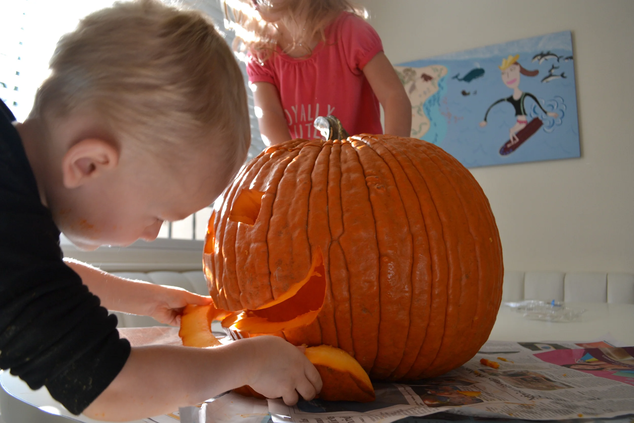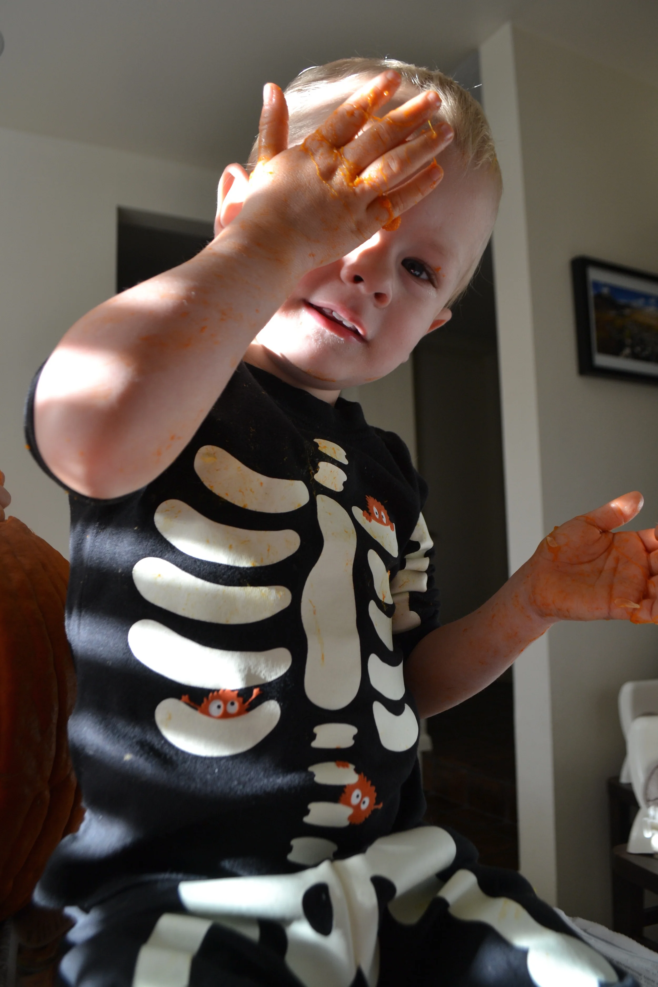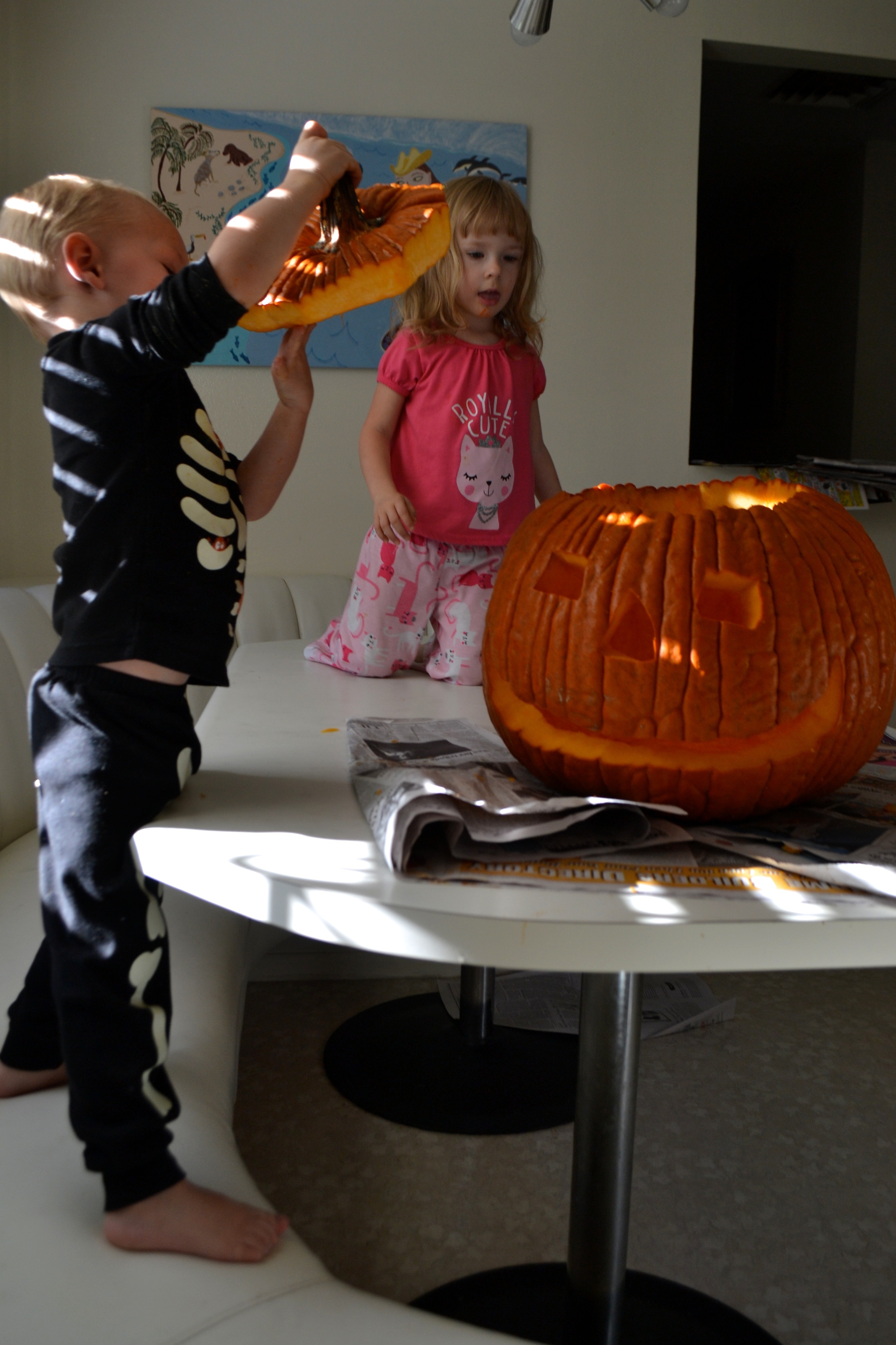 We carved our pumpkin in PJs this morning (I assumed it would be messy, and I was right), leeks for tonight's ham-and-leek quiche simmering in the background, the sun streaming in, the kids having fun especially with pretending they were excavators and wanting to do the job of removing the seeds all by themselves...they got out every last one.