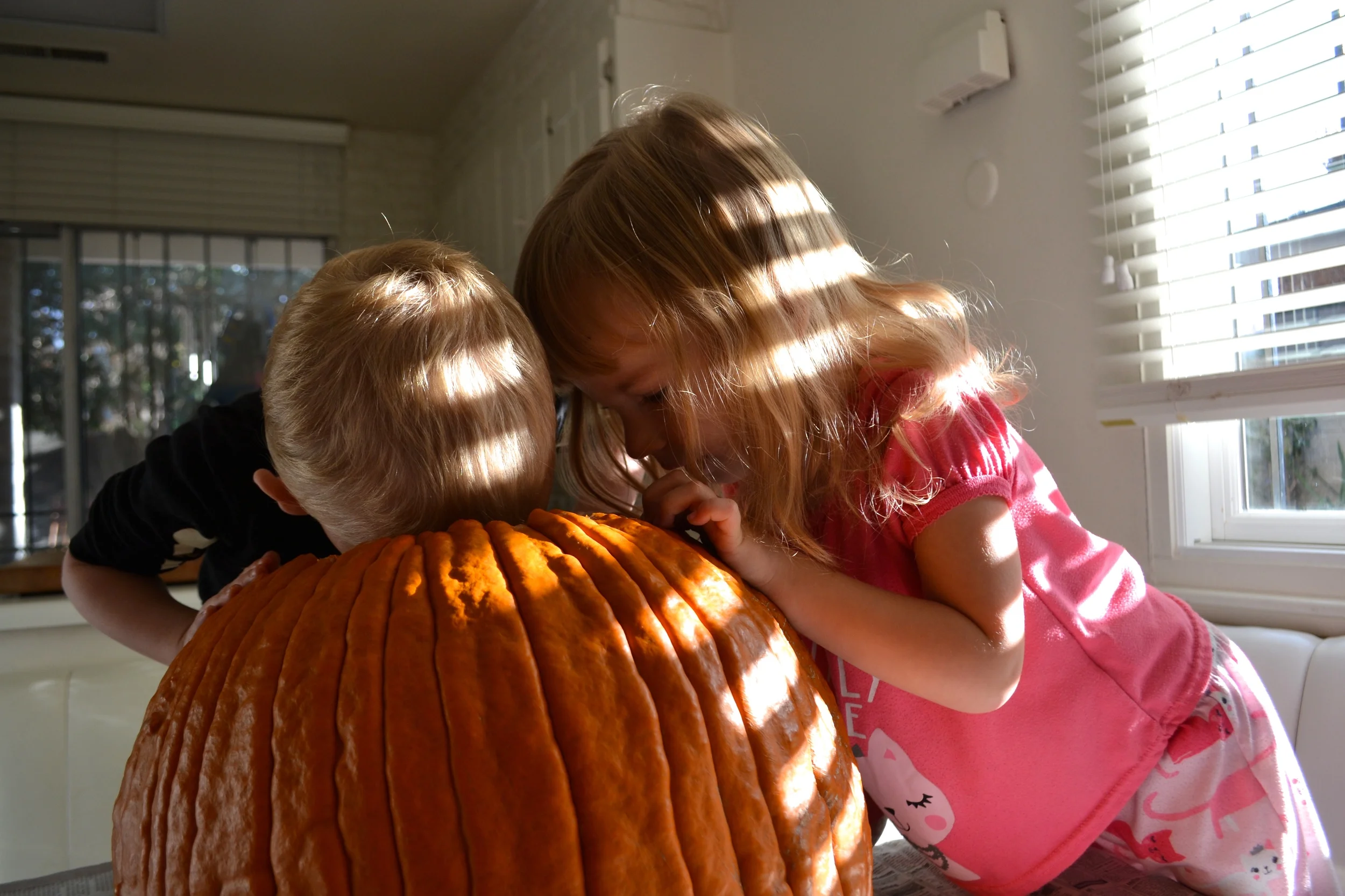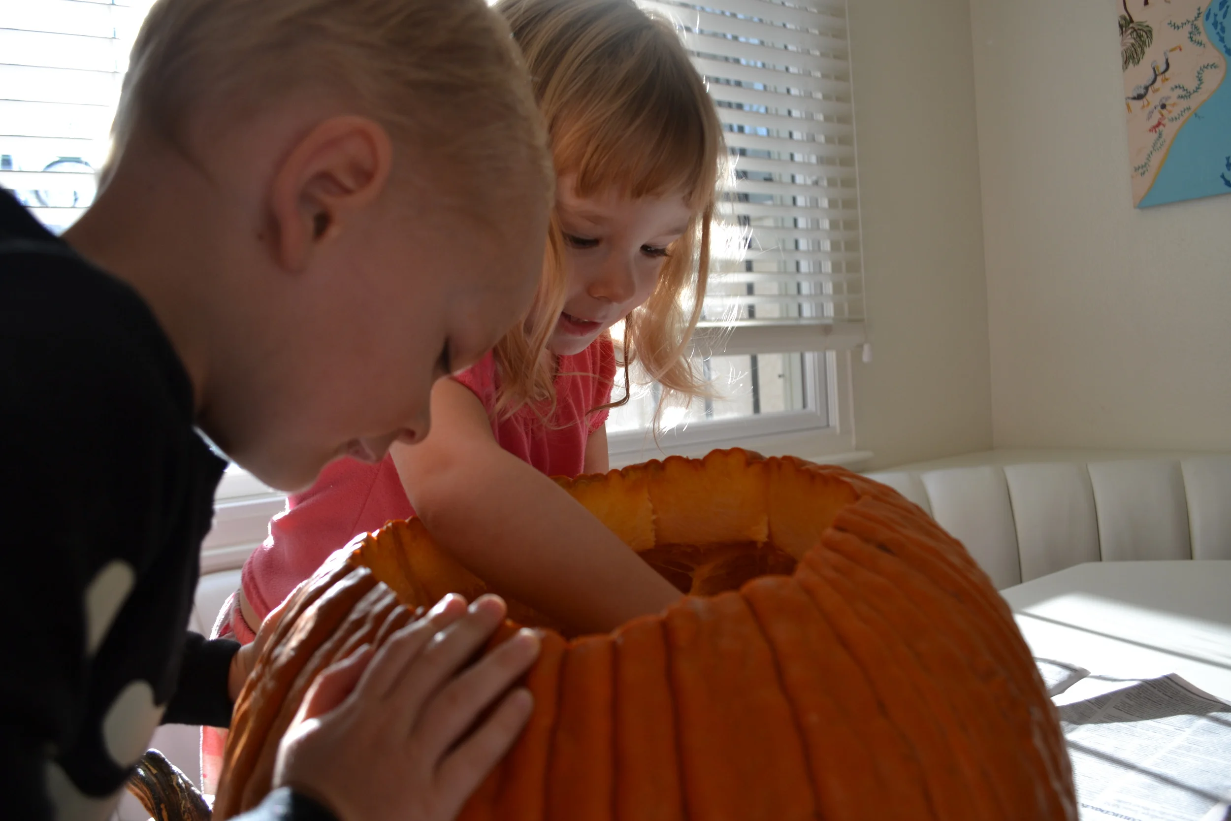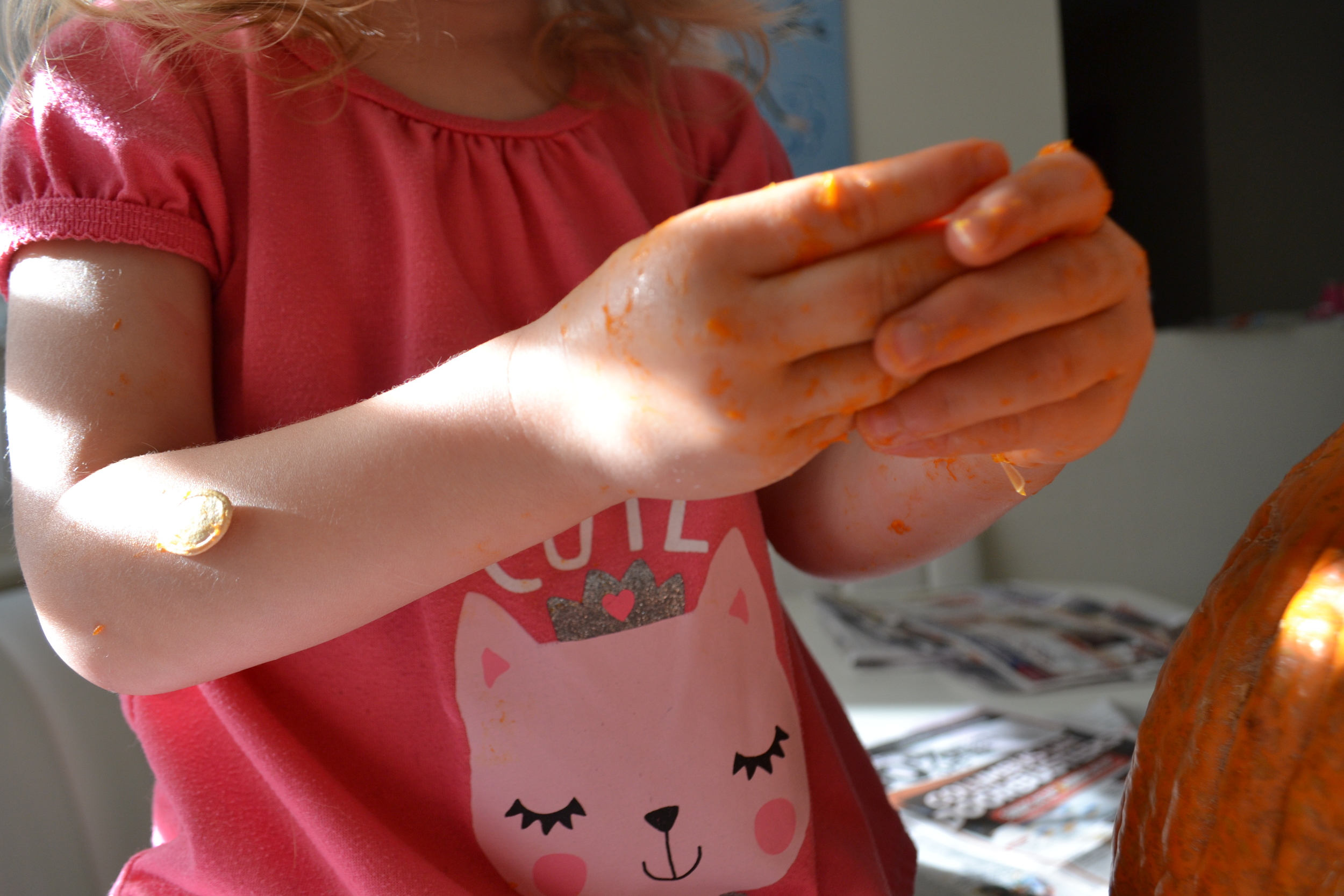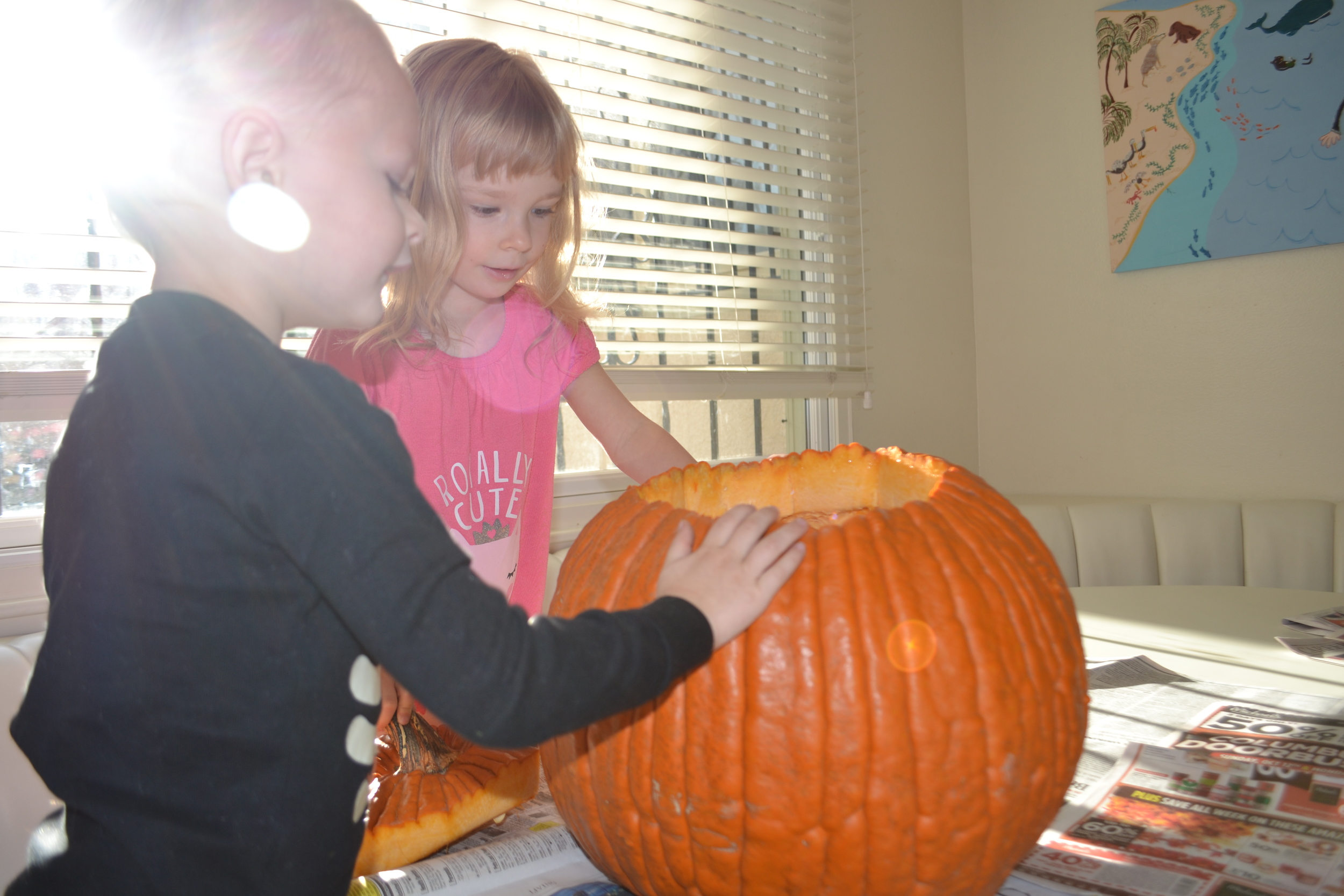We carved our pumpkin in PJs this morning (I assumed it would be messy, and I was right), leeks for tonight's ham-and-leek quiche simmering in the background, the sun streaming in, the kids having fun especially with pretending they were excavators and wanting to do the job of removing the seeds all by themselves...they got out every last one.