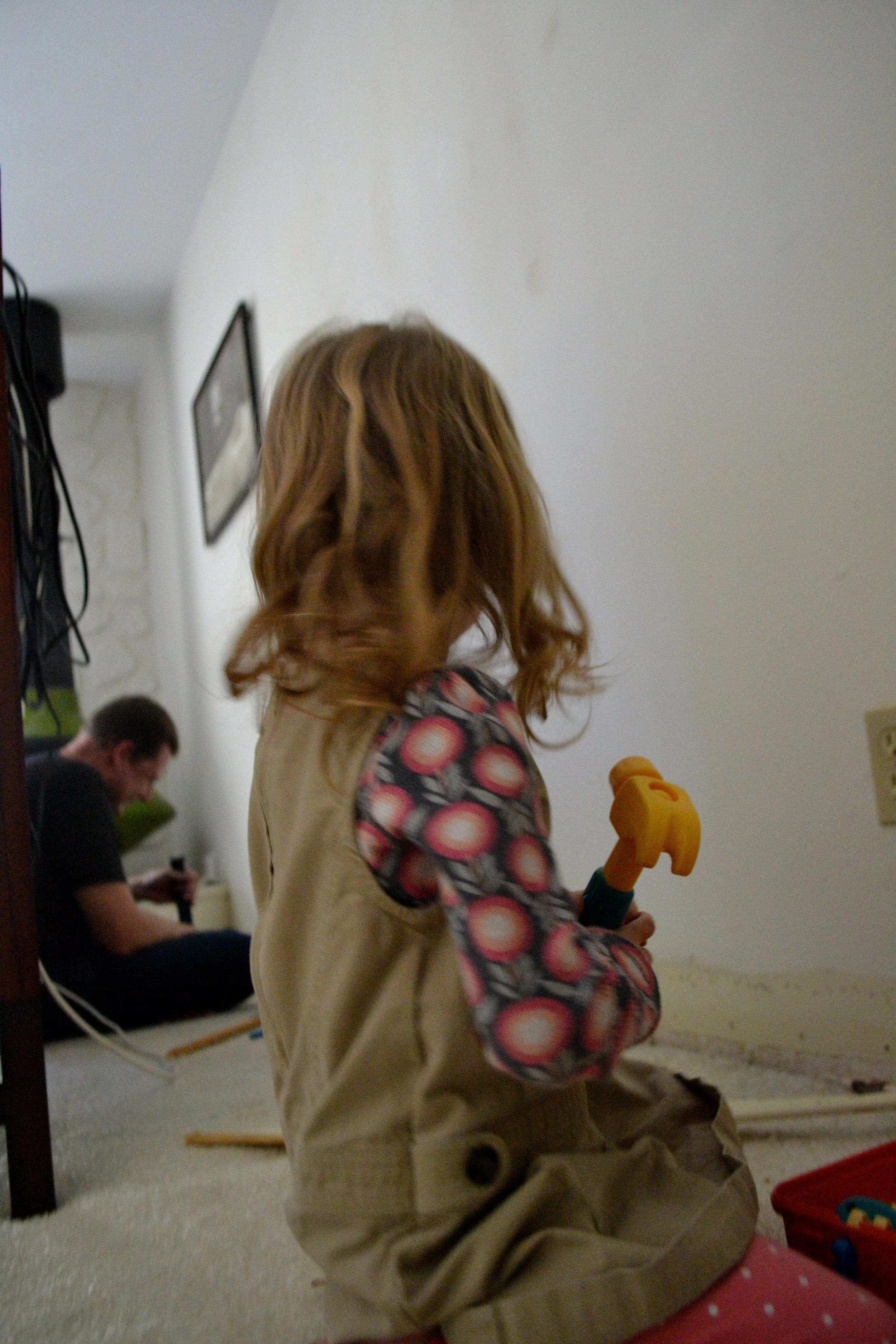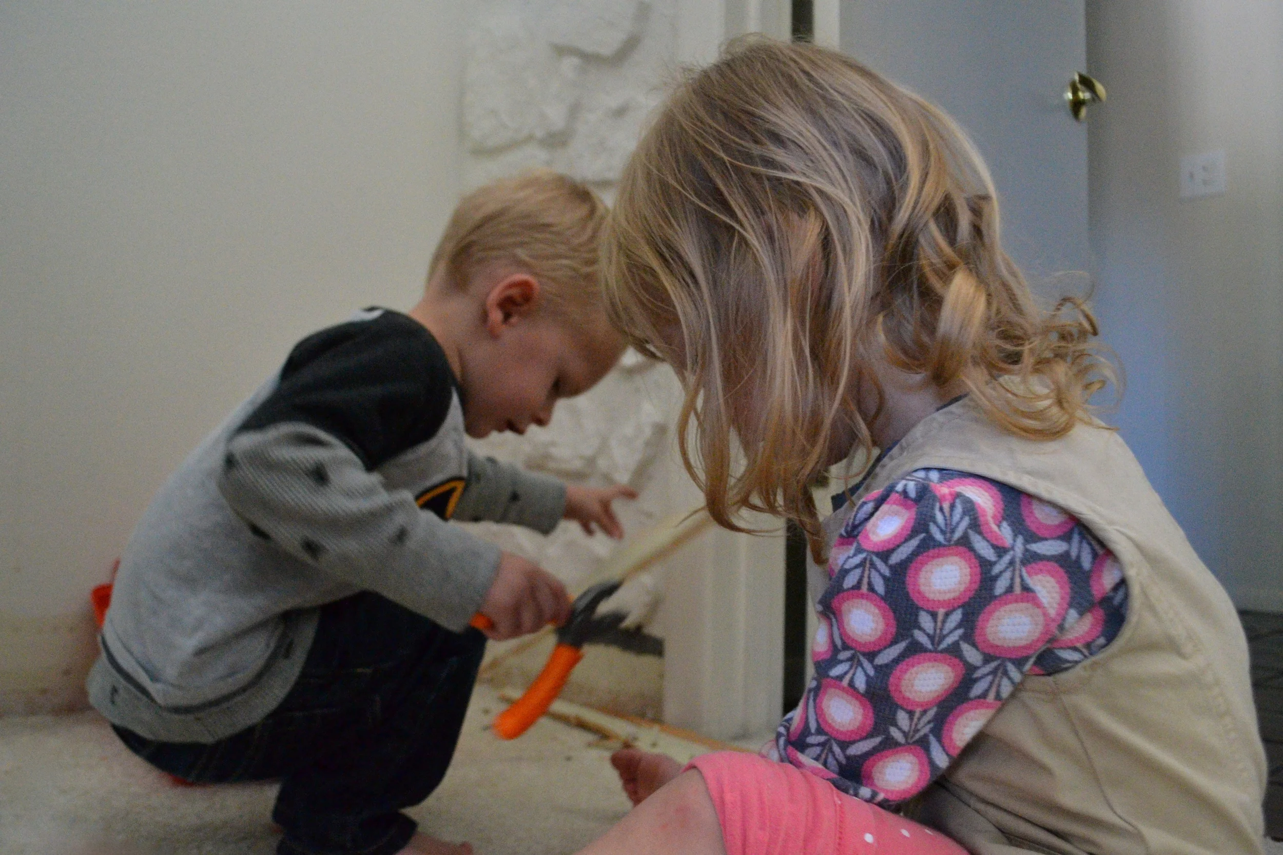 We're doing a little work on the house again...the big thing being a plan for new carpet in the bedrooms (a pretty gray instead of the snow white that we have now, which is filthy), so my husband has started prepping for that...we have these weird carpet baseboards that are coming off as part of that prep. Luke and Zo have a little box of plastic tools that they love to get out when Daddy is working on something. He's so good about letting them "help" him, as well.