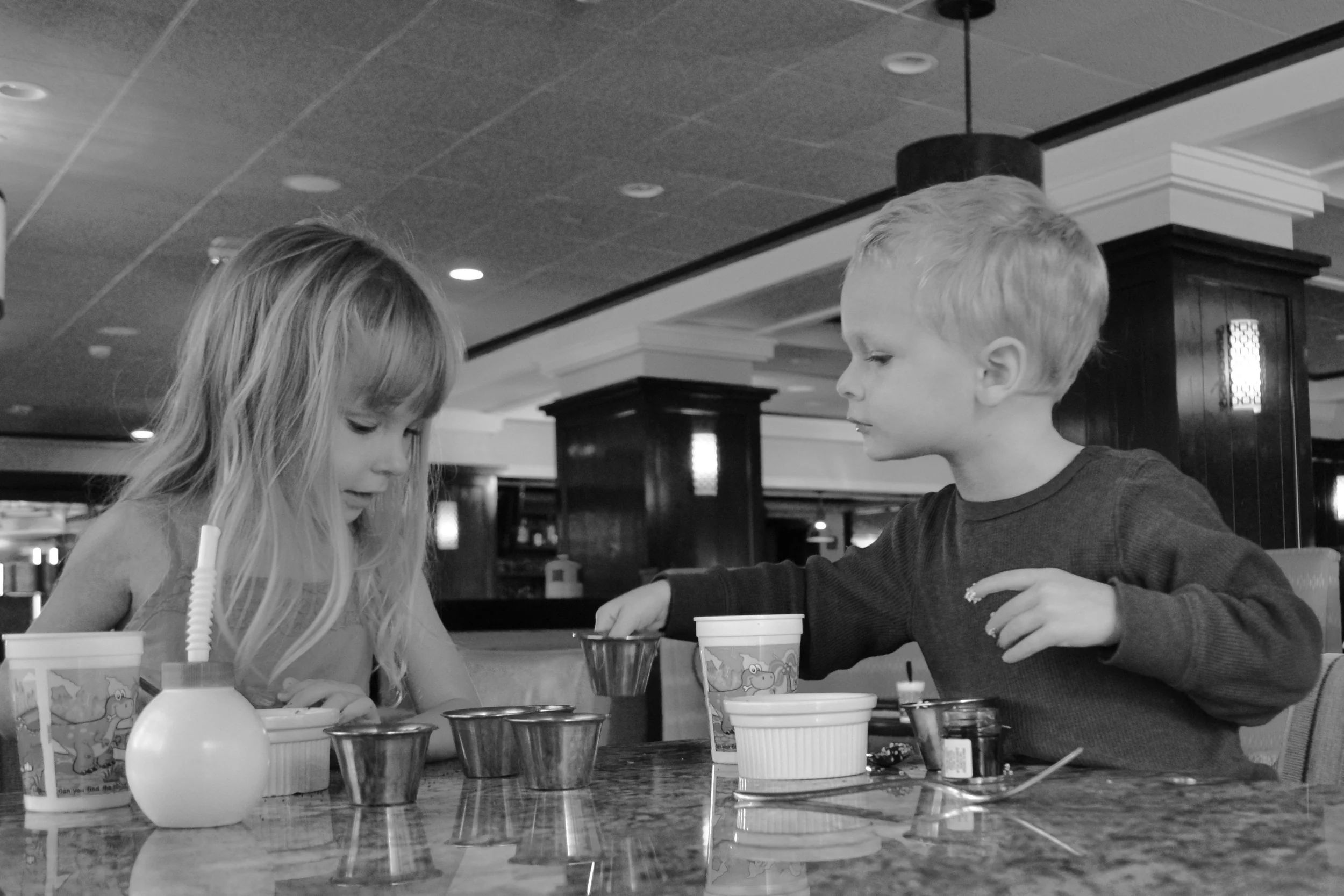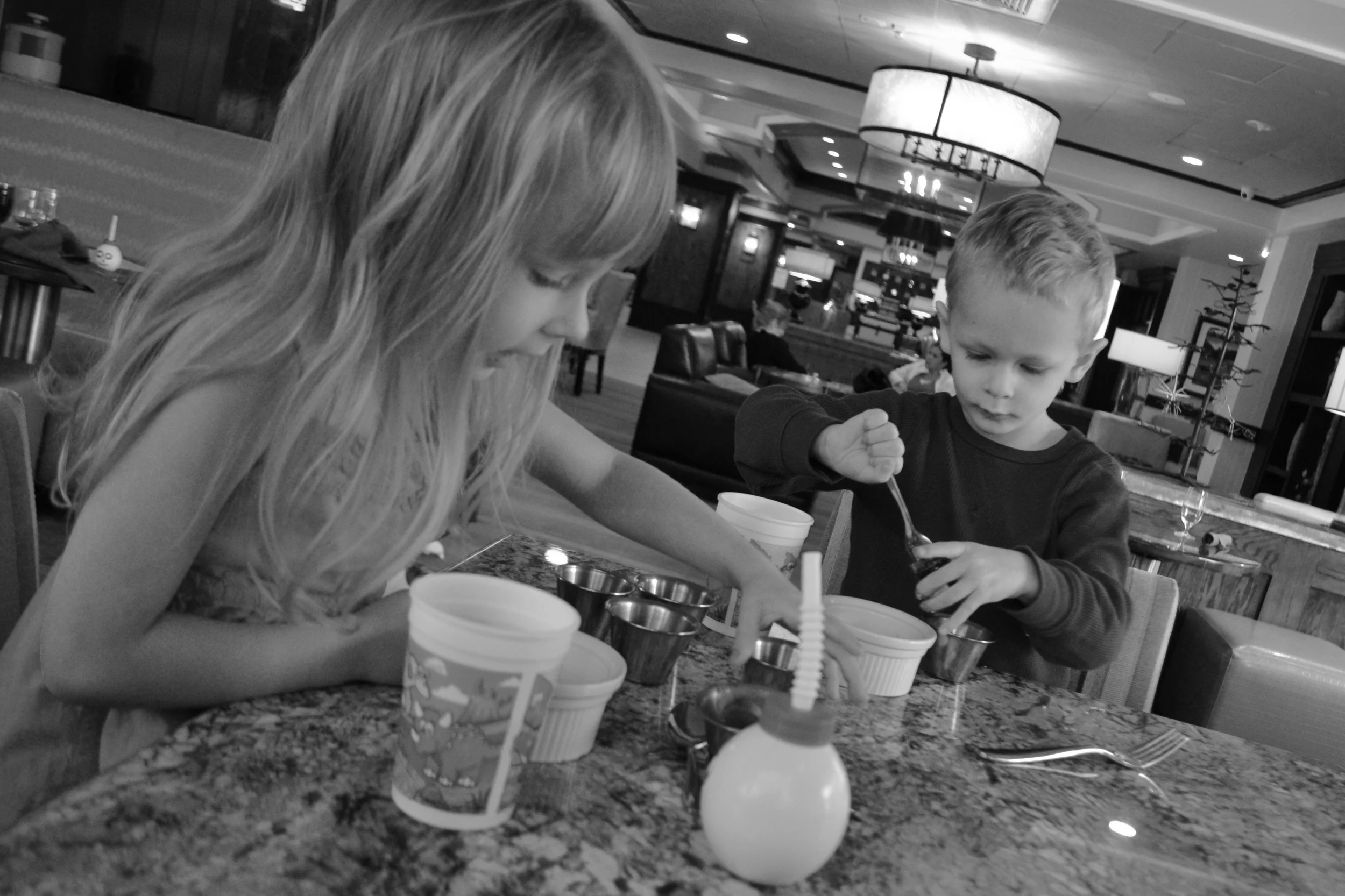 The manager at one of the restaurants at Daddy's hotel brought out a wild assortment of ingredients (fruit loops, mustard, basil, grape jelly, etc) for the kids to make soup for Daddy to try when he joined us. So sweet. Daddy's still trying to come up with a good way to get back at her. :)