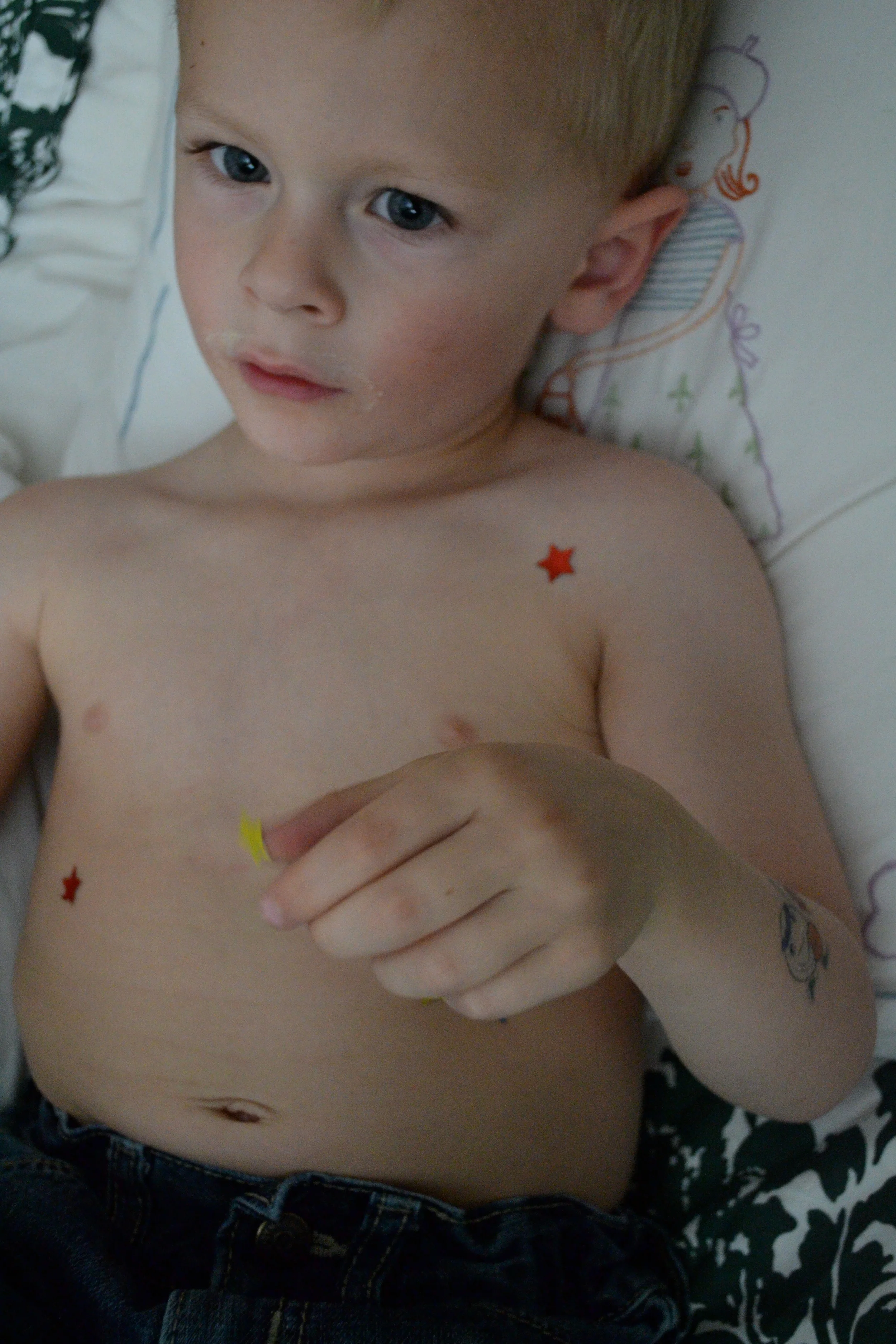Sometimes it's nice just to hang around the house without a lot going on, have a leisurely breakfast, play in the playroom, stay in PJs 'til 11 and then take off the shirt Mommy put on you so you can put star sticker all over your chest...