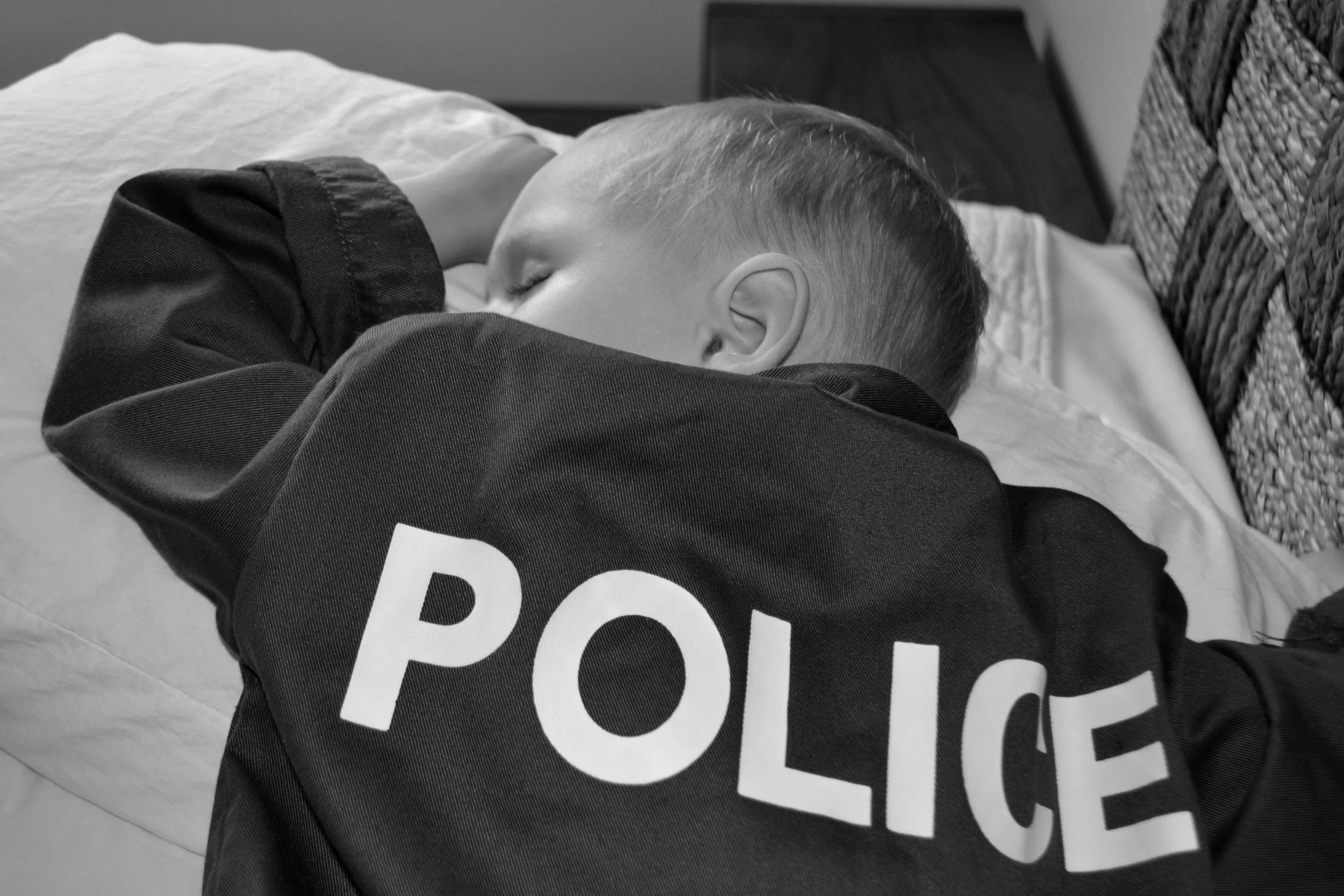 Policeman-in-training takes a nap Aug 27 Written By Kristen We were in jammies 'til nap time on this lazy, rainy day, and then Bubs wanted to sleep naked, which, whatever, and then he decided he needed to nap in his police costume... Kristen