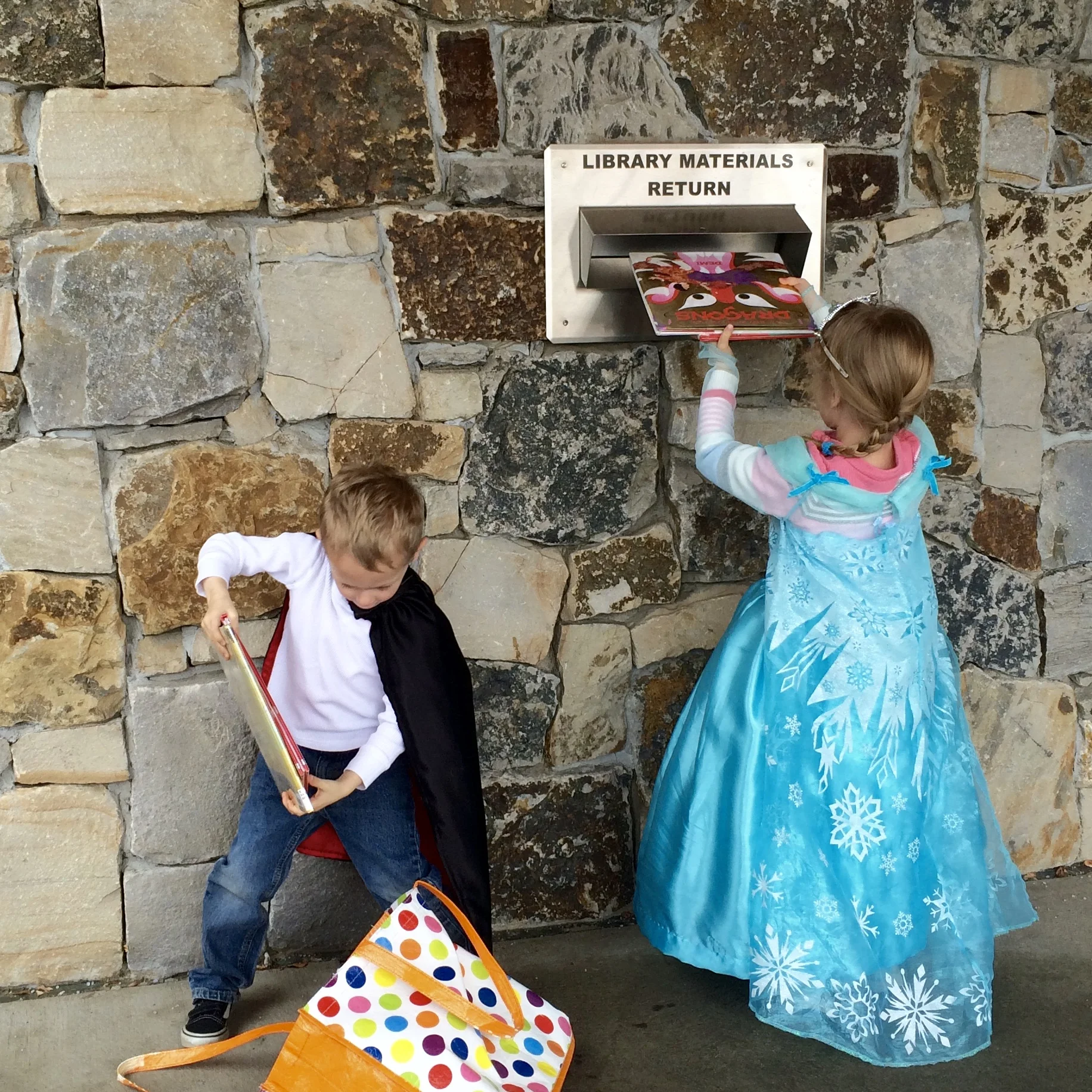 - Princess Elsa and Luke-the-caped-superhero returning library books...an unseasonably warm morning...