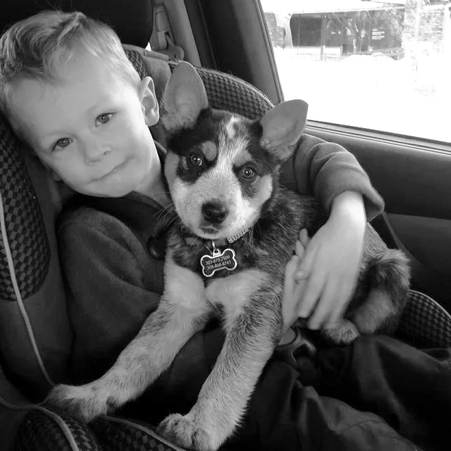 Luke and Bella Feb 23 Written By Kristen Ben and I took the kids skiing Sunday, and on the way home Luke asked if he could hold new puppy Bella. We were skeptical about how it would work out, but the puppy rode content in Luke's arms the whole way home...XO Kristen