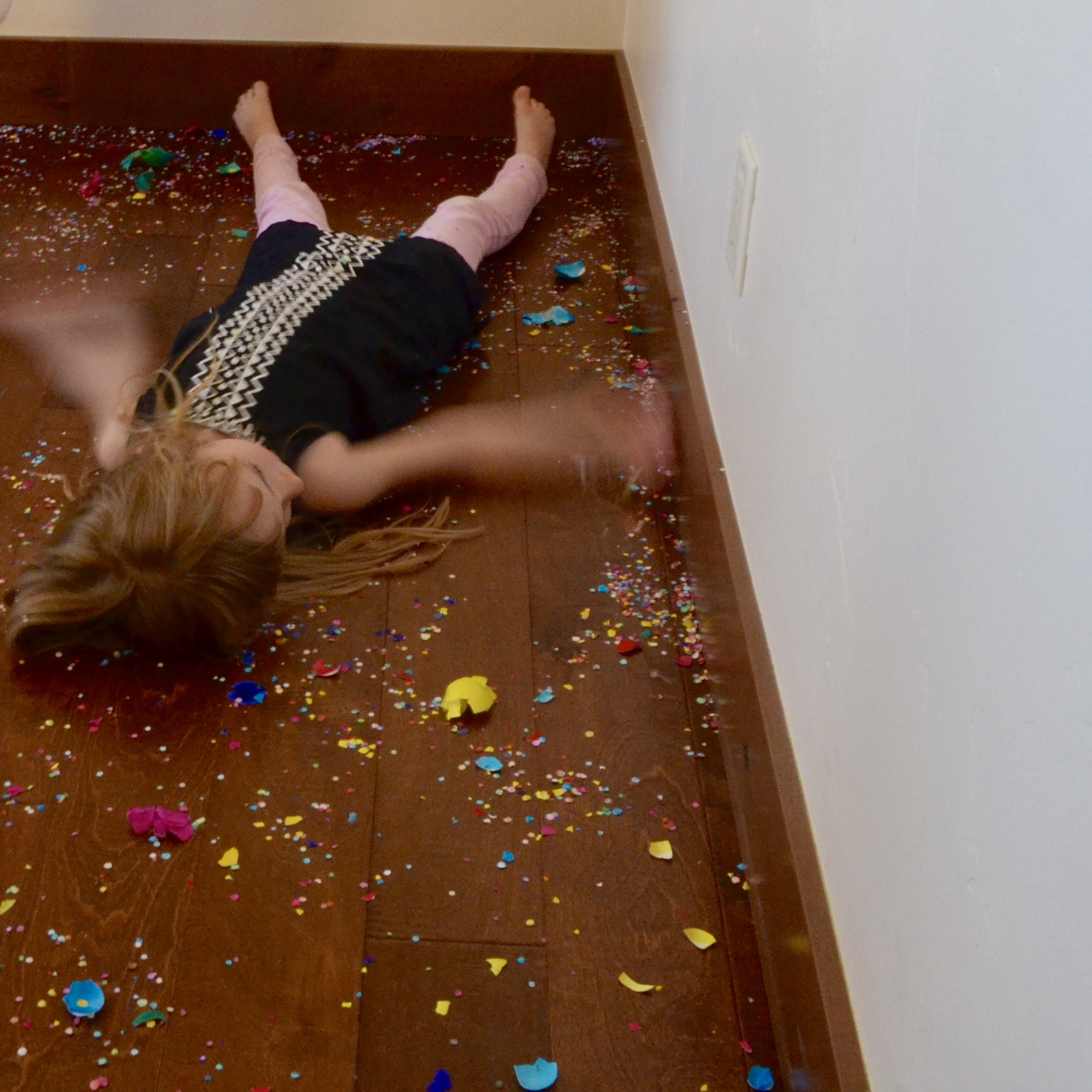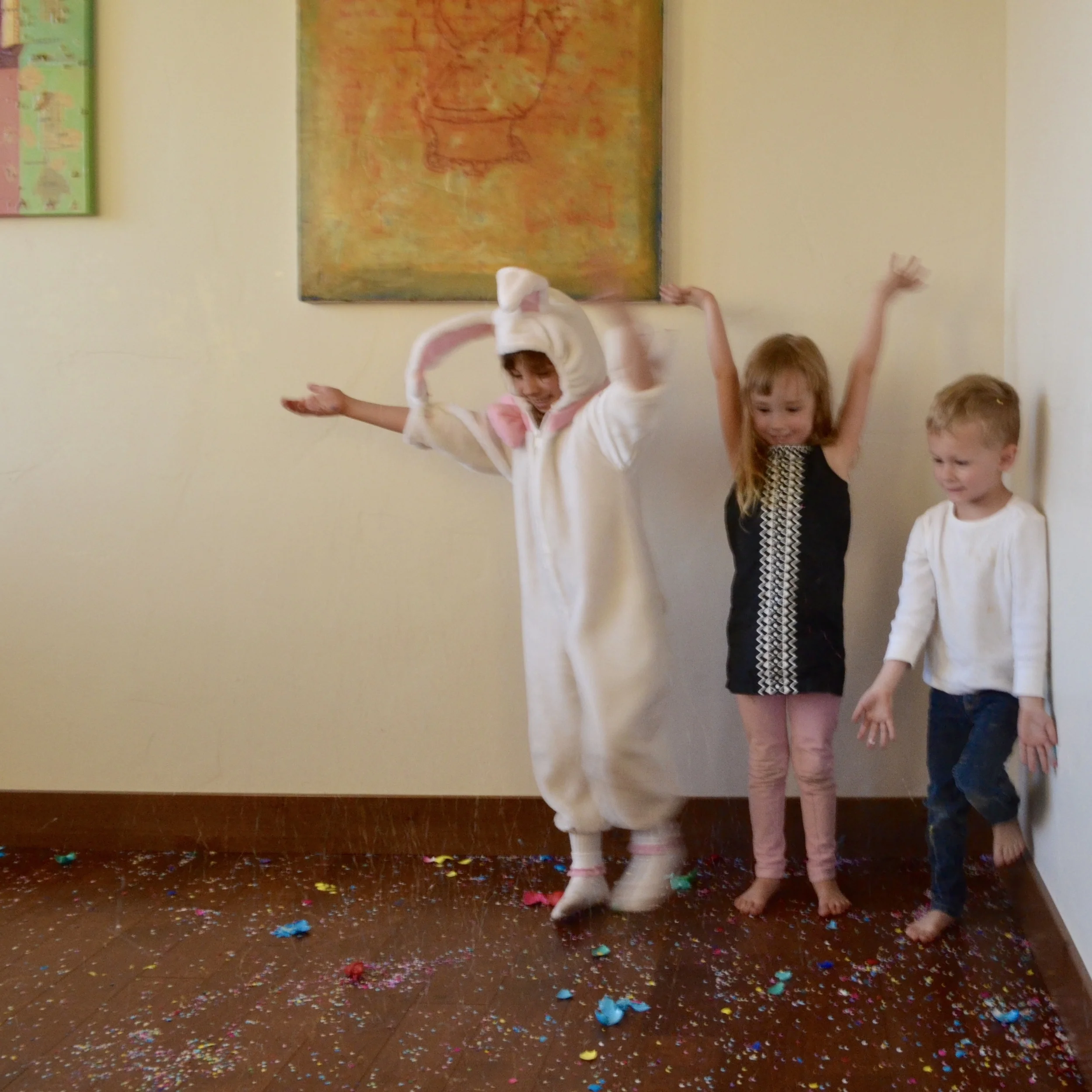 One of my favorite things about being in New Mexico was their Easter tradition of confetti eggs, which are--as you would expect--brightly dyed eggs filled with confetti. I found some up here...yay...and the kids and their sweet friend Enya had a blast with them yesterday after Easter dinner...Zo even made confetti angels, lol...