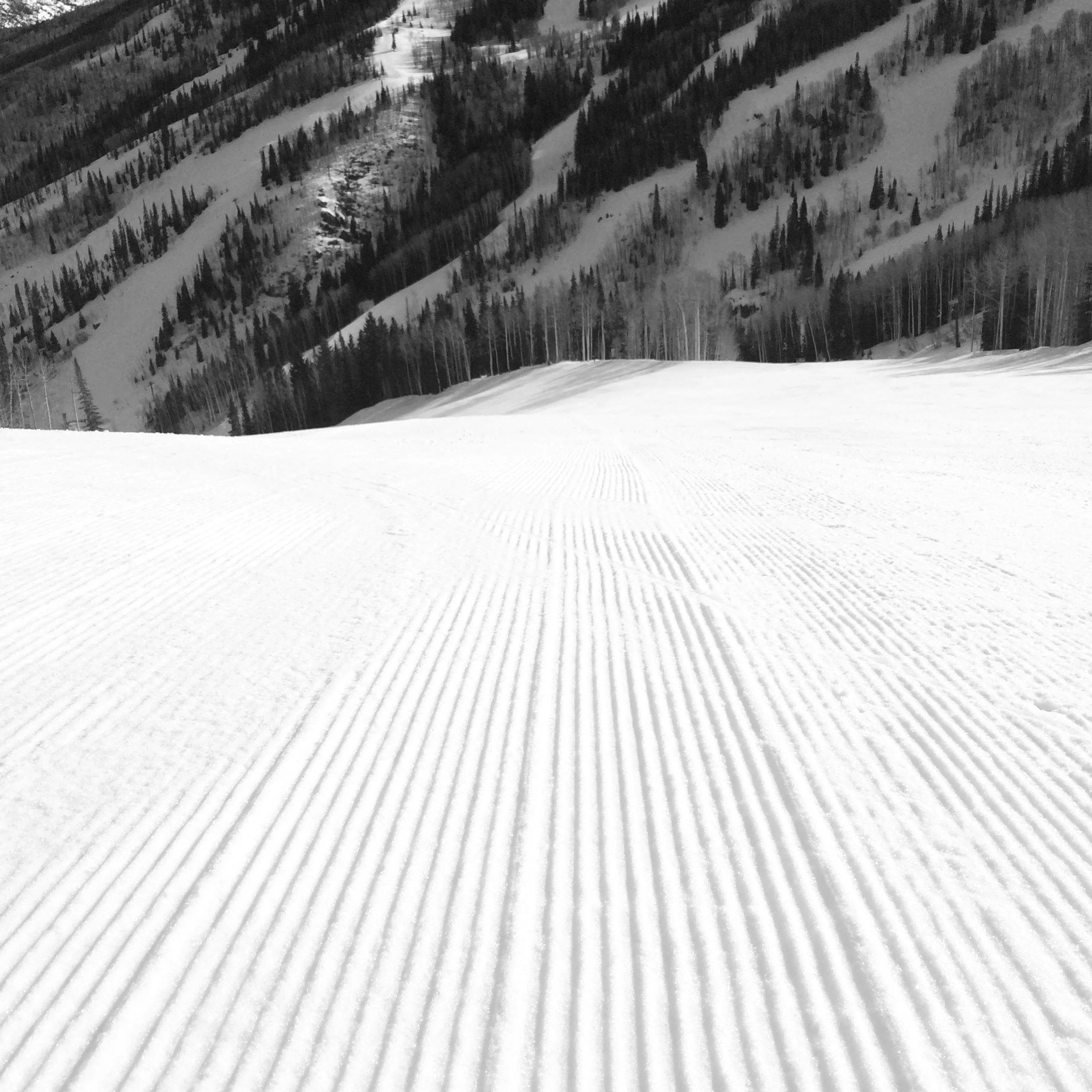 Got in line at 8:27 AM and onto the very first gondola at 8:30 AM...I thought I was the luckiest girl in the world, but turns out everyone else knew better than me...perfect corduroy ice is what I found...I did have the runs all to myself, though...and spent a lot of my hour and a half this morning getting all hippy-ed out, stretched out on my back, whole body pressed to the cold earth, then sitting and listening and watching, thinking that I won't see these views again until next December...saying thank you to the mountain for such a phenomenal season...
