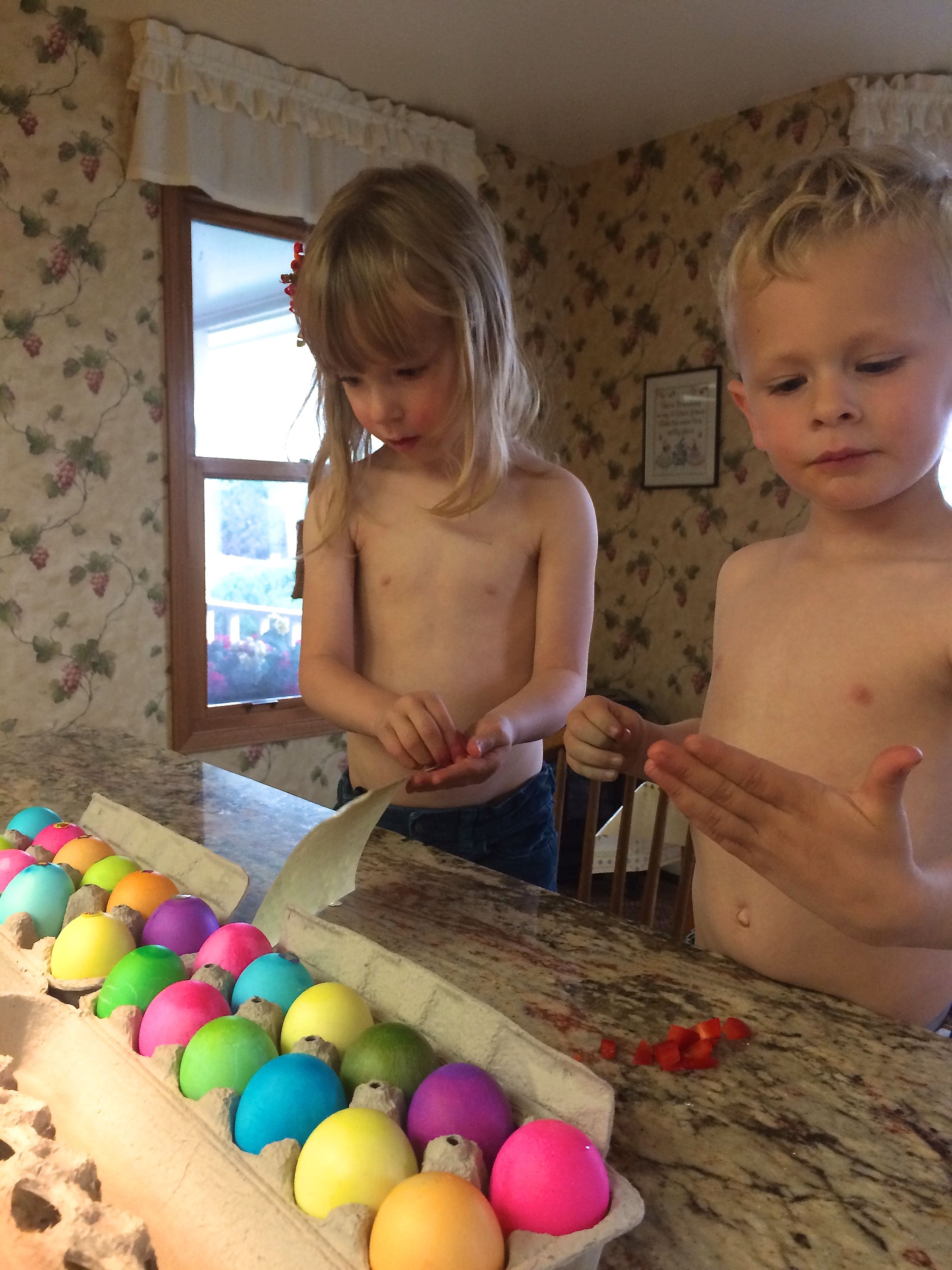 Not only did we have a great time dying eggs with Grammy the other day, but it also turned into a great lesson in color theory. What happens when you mix blue and yellow? (The green tablet wasn't dying the eggs a very dark green, but our mixture did a great job.) How about adding extra blue to the green? Blue and red? I tried to talk the kids out of mixing orange and green, but they insisted. Such fun...