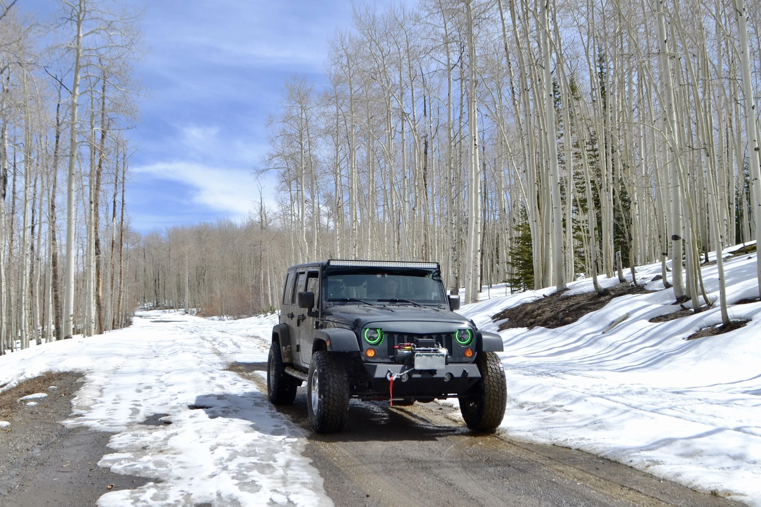 First Jeep trip of the year, up past Hahn's Peak, although we didn't make it far before turning around due to some serious snow. We had a great time and got the Jeep muddy, though! And played the animal game and saw 2 cranes and a whistle pig running across the road. We were trying to get to 11 animals today and made it...