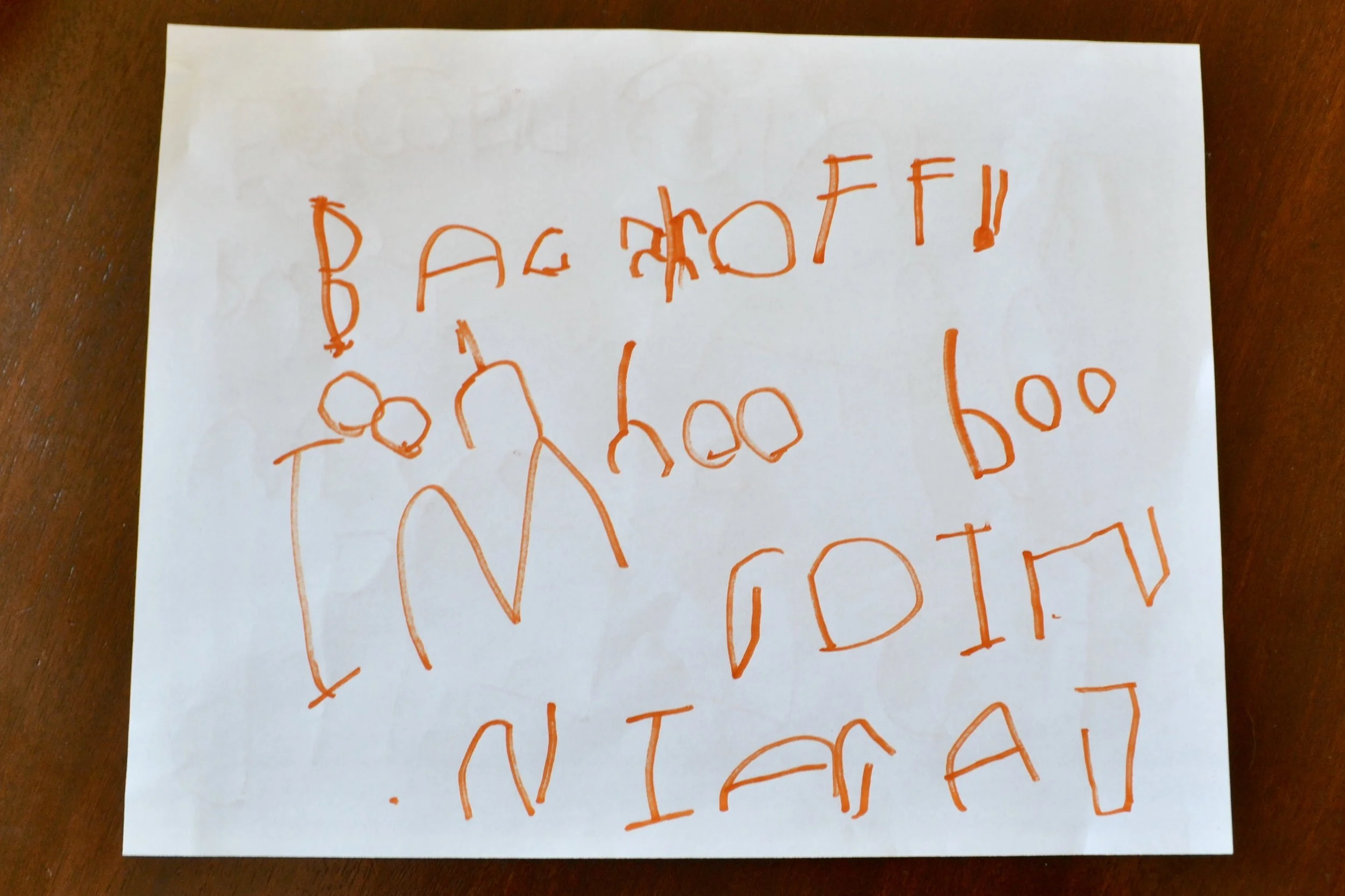 Sis asked the other day out of the blue if she could practice letters. I gave her paper and a pen and some books and suggested she copy some words. This is from Rude Cakes: "Back off! I'm going again!" And another character says "Boo hoo." I was blown away by her copying the letters. What a big kid moment! So proud...